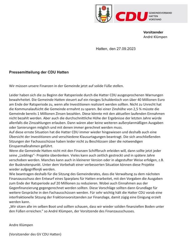 Faktencheck Alarmstufe Rot für den Haushalt. 🚨Risiko 1: Zinslastquote (Steigende Zinsaufwendungen)Dieses Risiko ist die direkte Folge der Schulden-Explosion. Da die Gemeinde 2026-2029 über 34 Mio. ? an Schulden anhäuft, explodieren auch die Zinszahlungen (S. 51, Z. 17):2026: 587.500 ?2027: 736.300 ?2028: 927.500 ?2029: 939.000 ?Risiko: Die Zinslast (eine völlig unproduktive Ausgabe) verdoppelt sich fast bis 2028. Diese knappe Million ? fehlt jedes Jahr für Straßen, Kitas oder Personal und "frisst" den Haushalt von innen auf.🚨Risiko 2: Personalintensität (Unrealistische Planung)Die Personalkosten sind der größte Einzelausgabenblock (10,7 Mio. ?). Die Planung bis 2029 (S. 51, Z. 13) birgt ein massives, verstecktes Risiko:2026: 10.722.900 ?2027: 10.932.400 ?2028: 10.932.400 ?2029: 10.932.400 ?Risiko: Der Plan geht davon aus, dass die Personalkosten nach 2027 nicht mehr steigen (eingefroren). Angesichts laufender Tarifverhandlungen (TVöD) und Inflation ist dies völlig unrealistisch. Jede Tariferhöhung (z.B. 5 %) würde das Defizit sofort um über 500.000 ? weiter erhöhen. Die tatsächlichen Defizite werden also voraussichtlich noch höher ausfallen als geplant.🚨Risiko 3: Substanzverzehr (Reinvestitionsquote)Ein gesundes Gemeinwesen muss mindestens so viel investieren, wie seine Infrastruktur an Wert verliert (Abschreibungen).Abschreibungen 2026: 2.932.400 ? (Wertverlust)Investitionen 2026: 2.580.400 ? (Neubeschaffung)Risiko: Schon 2026 investiert die Gemeinde weniger als sie "abnutzt". Dieses Problem wird sich in den Folgejahren drastisch verschärfen. Wenn die Zinslast steigt (Risiko 1) und die Personalkosten steigen (Risiko 2), wird das erste, was gestrichen wird, die "freiwillige" Investition in den Erhalt von Straßen und Gebäuden sein. Die Infrastruktur der Gemeinde droht (abgesehen von den Leuchtturmprojekten wie der Schule) zu verfallen.🚨Risiko 4: Wachsende TransferlastenDie Ausgaben, die von der Gemeinde nicht kontrolliert werden können, steigen ebenfalls weiter an (S. 51, Z. 18):Transferaufwendungen (inkl. Kreisumlage):2026: 11,54 Mio. ?2029: 12,30 Mio. ?Risiko: Dieser Posten wächst um 760.000 ? und sorgt für zusätzlichen, externen Druck auf den Haushalt, der zukünftig durch interne Sparmaßnahmen nicht mehr kompensiert werden kann.#cduhatten #gemeindehatten